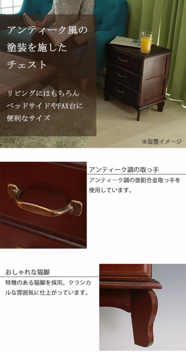 | 特徴のある猫脚を採用したチェスト。アンティーク調の亜鉛合金取っ手を使用、引き出しはアウトセットです。リビングにはもちろん、ベッドサイドやFAX台として等多用途に使えます! |