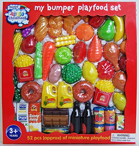 What's cooking!? 52 piece play food set, Includes canned, packaged, prepared, and natural foods. Fruits, vegetables, and junk food. Pastries and desserts included as well!