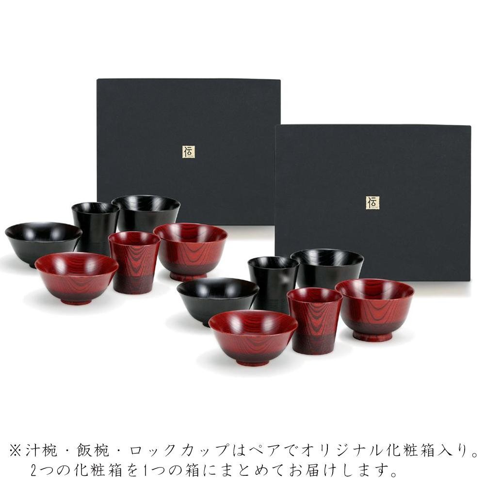 | 山中漆器伝統の技とこだわりをふんだんに生かした国産木製漆器シリーズ「伝」(つたえ)の汁椀・飯椀・ロックカップの各4個セットです。天然木、漆塗ならではの温かみをお楽しみください。 |