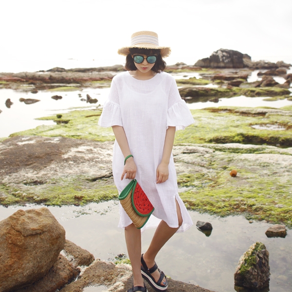 옆트임이 있는 언발런스 기장의 롱 원피스로 시원하면서 로맨틱한 여름을 보내기 좋은 아이템.