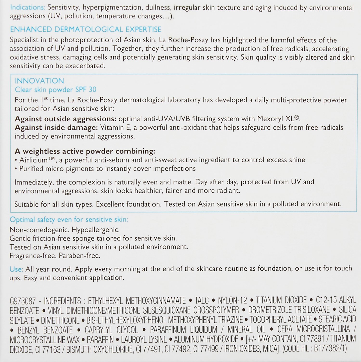 Oxyphenol methoxyphenyl triazine, tocopherol acetate, stearic acid, benzyl benzoate, caprylyl glycol, mineral oil, microcrystalline wax, paraffin, lauroyl lysine, hydroxide AI, [+/-] titanium oxide, bismuth oxychloride, oxidation
