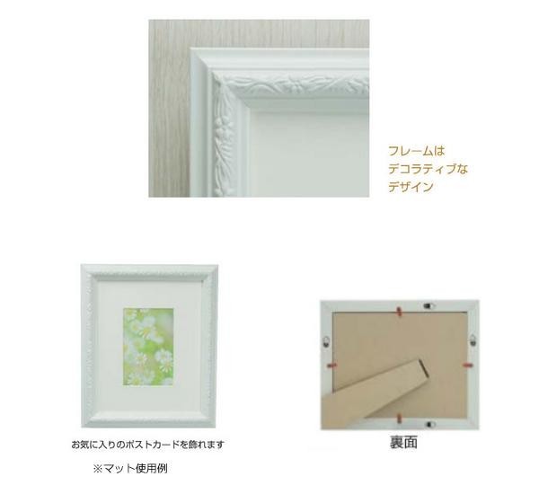 | デコラティブな白いフレームがおしゃれな額です。マットを使えばポスト判の作品も飾ることができます。 |