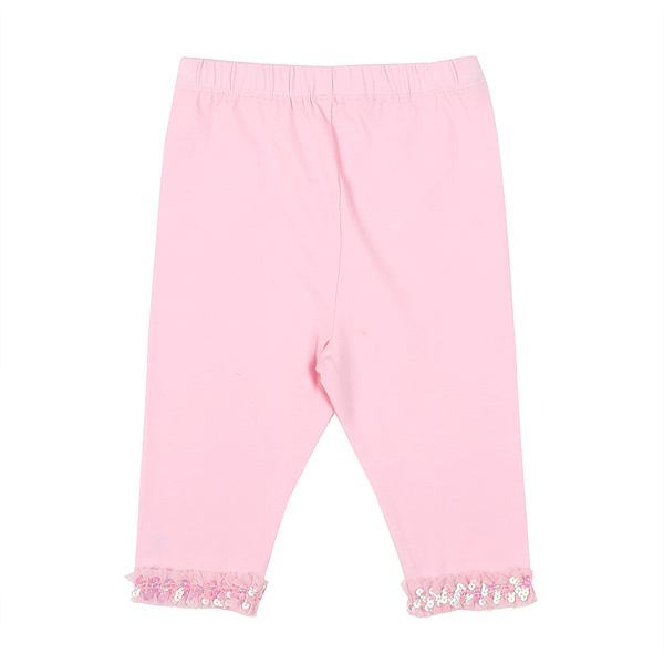 핑크 쫄바지 입니다. 기본 쫄바지보다 멋스러운 스타일로 6부 기장으로 바지끝단에 스팽글레이스 프릴이 덧데어져 러블리한 느낌을 줍니다. 핑크나염배색 롱티 또는 인어공주롱티,스커트속에 코디하시기 좋습니다.