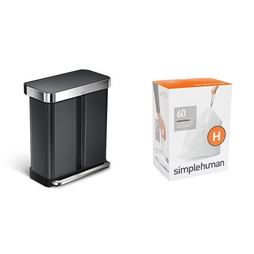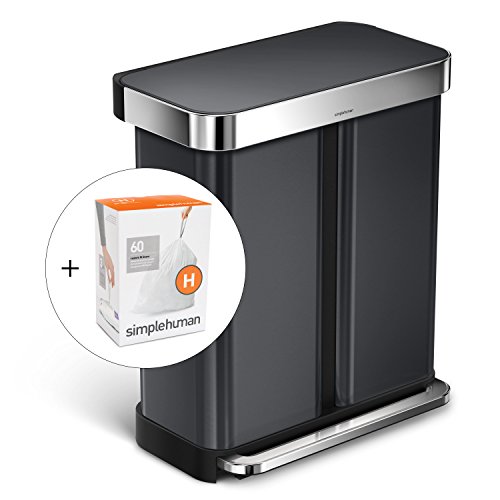 simplehuman 58L Dual Bucket Rectangular Recycling Step Trash Can with Liner Pocket, Black Stainless Steel, with 60 pack custom fit liner code H