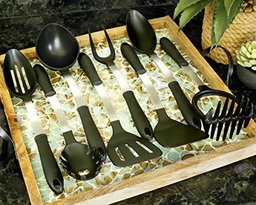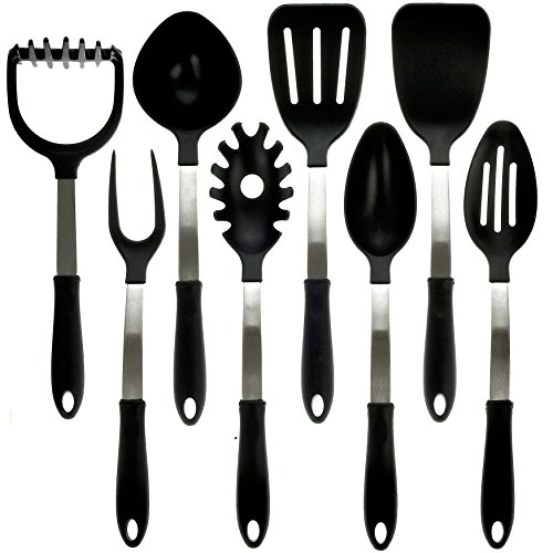 -. Feature : High Quality Cooking Utensils Set made out of Stainless Steel with nylon heads and soft touch handles. High durability cooking utensils with a comfortable grip. / 8 Piece Kitchen Cooking Utensils Set including a slotted spoon, nylon ladle, meat fork, solid turner, slotted turner, masher, basting spoon, and pasta server. / MADE IN USA - Premium Safe and Highest Quality Cooking Utensils Set. / Beautiful design of mixed stainless steel with solid black nylon heads. Will not scratch cookware or bakeware. Hanging loops at end of handle for easy organization to show off sleek stainless steel cooking utensils set. / Dishwasher safe for easy cleanup. BPA Free. Heat resistant up to 400 degrees.