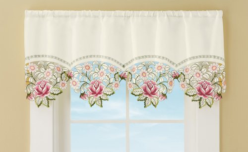 Beautifully embroidered roses in soft shades of pink and mauve make this valance a lovely way to frame your view. Perfect anywhere in your home, it features intricate cutwork and exquisitely embroidered details. Rod pocket top. Machine wash. Polyester; imported. 40"W x 16"L.Feature