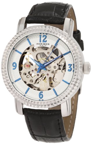 -. Feature : Akribos xxiv ladies sophisticated wristwatch / Skeleton dial gives you a clear view of the well-crafted automatic movement / Black genuine leather croco pattern strap / White embossed outer dial, silver skeletal center / Not water resistant