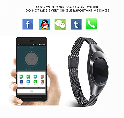 -. Feature : Unique Fashionanl Design: The appearance looks like jewelry.Different colour for you choose.Fashion,elegance and simplicity.Innovation and creation make life more wonderful and fashion is always our attitude,just for fabulous you. / Heart Rate and Blood Pressure, Blood Oxygen Monitor function give you a health monitor,your P.R.Ivate fitness tracker doctor.But Heart Rate /Blood Pressure and Blood oxygen data is for reference only(It's may not be 100% accurate),not suitable for medical purpose and hospital doctors diagnosis! / Waterproof Materials, not afraid of washing hands,doing housework,walking under rain.Magnetic USB cable easy for you to charge, / Automatic screen activation:raising your hand,the screen will bright,when you want to watch time;this functioncan can save the power.Remotel control camera:Wear a bracelet, and the shake the braclet,you can control your phone's camera. / Compatibility: Compatitble with all Android & IOS Smartphones.Android smart phones with Bluetooth 4.0 and Android 4.4 or above system. IOS 8.0 and above system (Notice: Message reminder only for Android)