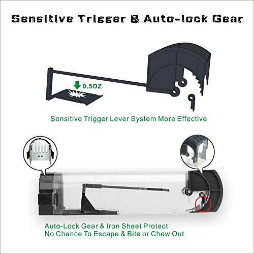- Effective Sensitive Pedal. Spring-loaded lever system on the outside, the gear-type door locked INSTANTLY once the pedal trigged. No damage and escape-proof when mice/rats trapped inside
