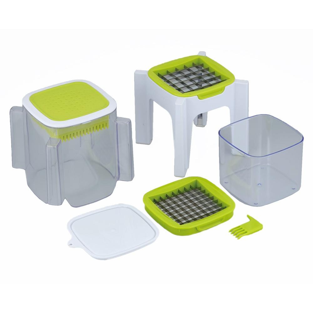 | 押すだけで簡単にさいの目切りができます。受け容器はシール蓋が付属しているので、カットした野菜をそのまま一時保存もできます。 |