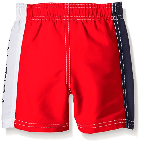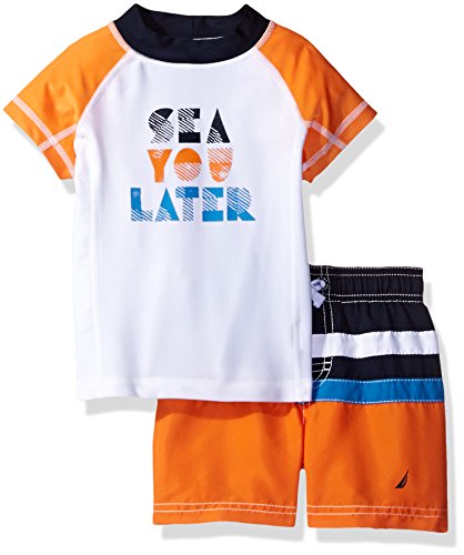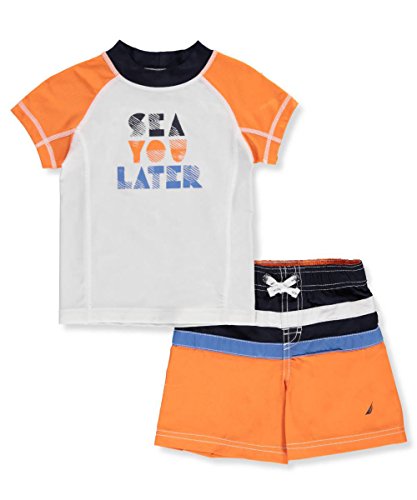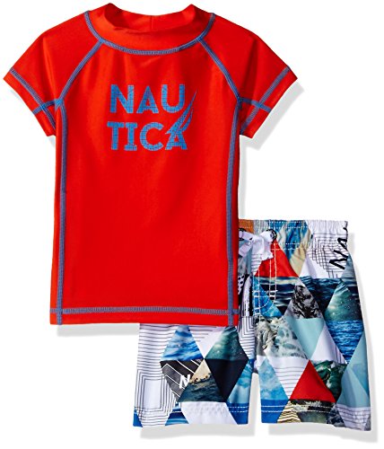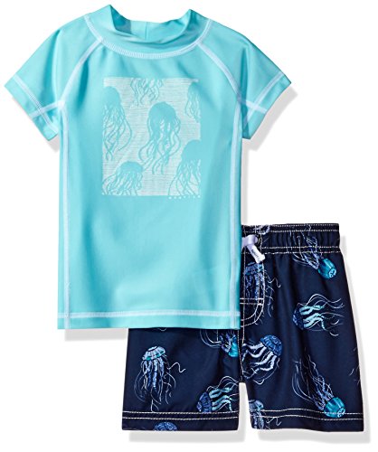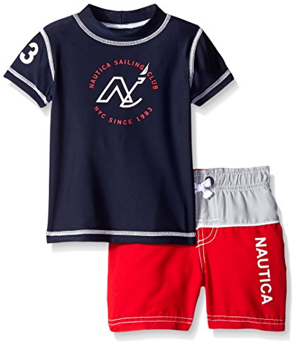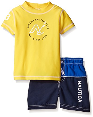 Two-piece swim set featuring short-sleeve rash guard with low-standing collar
