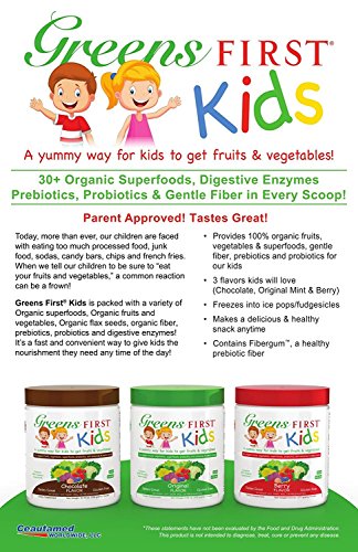 Greens First® Kids is packed with a variety of Organic superfoods,Organic fruits and vegetables, Organic flax seeds, prebiotics,probiotics and digestive enzymes! It's a fast and convenient way to give kids the nourishment they need to start the day. Greens First® Kids is also great as a natural energy snack between meals or after activities. Today, more than ever, our children are faced with eating too much processed food, junk food, sodas, candy bars, chips and french fries. When we tell our children to be sure to "eat your fruits and vegetables," a common reaction can be a frown! Greens First® Kids is packed with a variety of Organic superfoods, Organic fruits and vegetables, Organic flax seeds, organic fiber, prebiotics, probiotics and digestive enzymes! It's a fast and convenient way to give kids the nourishment they need any time of the day!Feature