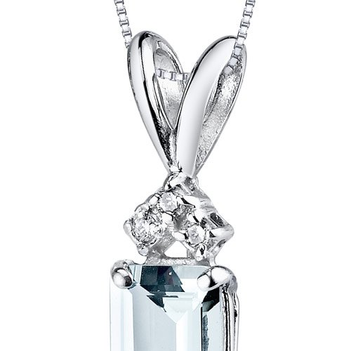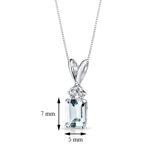Gemstone: Genuine Aquamarine, Emerald Cut, 7 x 5 mm, 0.81 carats, Ice Blue Hue with Brilliant Sparkle. 0.03 carat genuine Diamond with G-H color and SI1-SI2 clarity. Pendant: 0.8 grams pure 14k White Gold with 14k stamp. Pendant feature exceptional Design, Craftsmanship and finishing. Perfect gift for Mothers Day, Birthdays, Valentines Day, Graduation, Christmas or just about any other occasion. Money Back Guarantee. Includes a Signature Gift Box. Includes matching 18 inch Sterling Silver Rhodium Finish Box Style Chain. Style P9064Feature