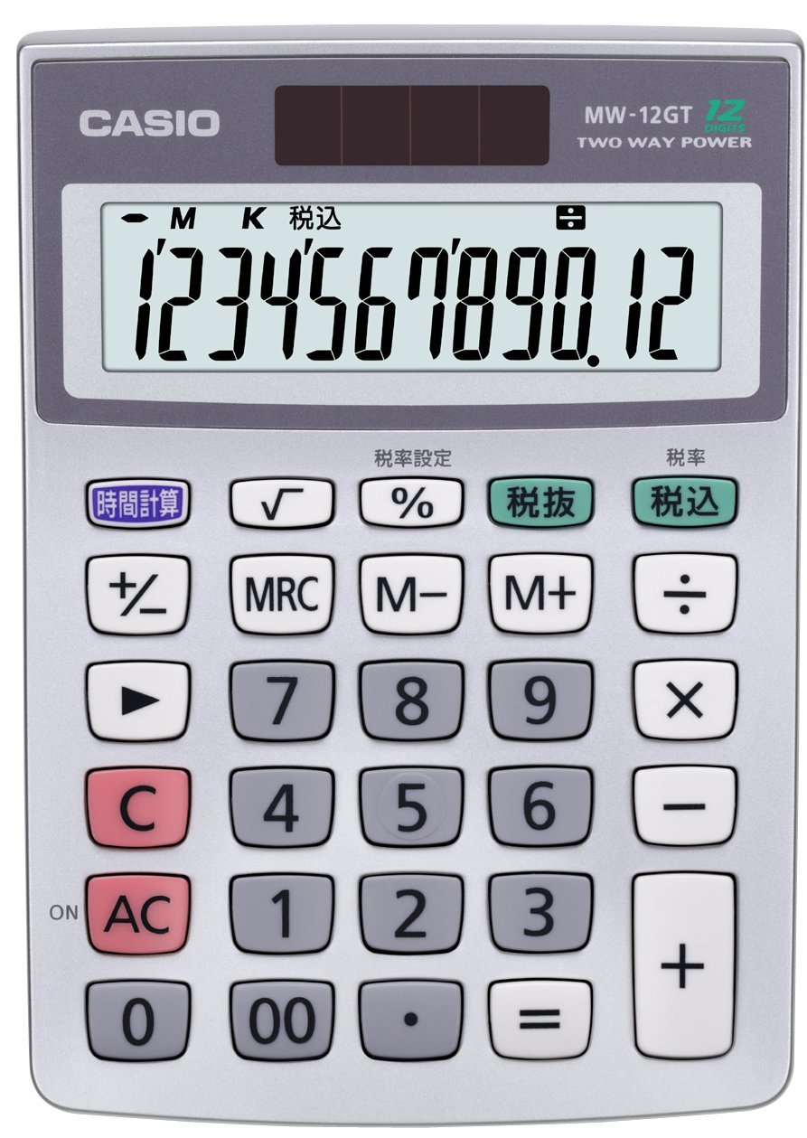 サイズ:ミニジャスト スタイル:12桁 ●桁数:12 ●メモリー:1 ●電源種類:T・W・P(太陽電池と補助電池の併用)(CR2032) ●電池数:1 ●電池寿命:約7年 ●大きさ(奥行×幅×高さ)mm:145×100×30.7 ●質量(g):110 機能:税計算,時間計算,計算状態表示,マルチ%,√(平方根),四則定数計算,概数計算,桁下げ(シフト),+/-(サインチェンジ),キーロールオーバー機能(早打ち機能),ツーゼロキー 机の上をスッキリ整理! ミニジャストタイプ電卓