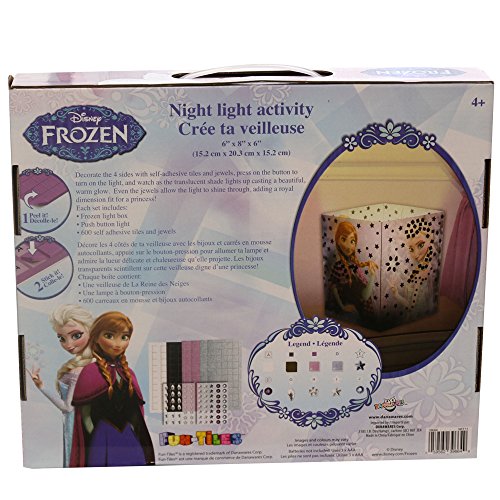 -. Binding : Toy -. Brand : Frozen -. EAN : 0059562396649 -. Feature : Product dimensions: 15cm x 20cm x 15cm / Push button light for easy on and off / Batteries not included (3 x AAA) / For ages 4 and up -. IsAdultProduct : 0 -. ItemPartNumber : 39664 -. Label : DanaWares Co -. Manufacturer : DanaWares Co -. Model : 39664 -. MPN : 39664 -. PackageQuantity : 1 -. PartNumber : 39664 -. ProductGroup : Toy -. ProductTypeName : TOYS_AND_GAMES -. Publisher : DanaWares Co -. Studio : DanaWares Co -. Title : Frozen Girls Fun-Tiles Night Light Activity Kit -. UPC : 059562396649 -. Warranty : No Warranty