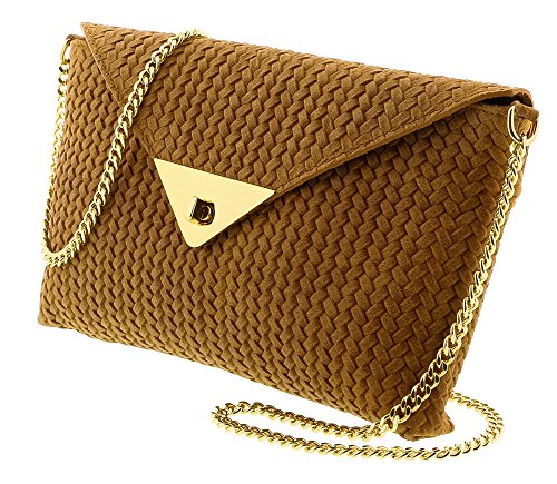 -. Feature : 100% genuine leather in distressed finish with a weave textured finish- Rectangular envelope clutch/shoulder bag- Minimalist design-Dimensions:-10-6.5-1.5 / Gold hardware -Top zippered entry / Front flap with turn lock closure - Fabric interior - Adjustable/Deatachable shoulder strap L=46in / Timeless versatile style wear on the hand or shoulder, elegant and ladylike - easy wear / Made in Italy - Comes in original dustbag