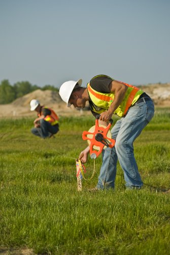 Tape comes with an anodized aluminum stake used in conjunction with 3 ring attachments for 1 person measurements - rings fit inside integrated storage handle and stake stows on side of tape