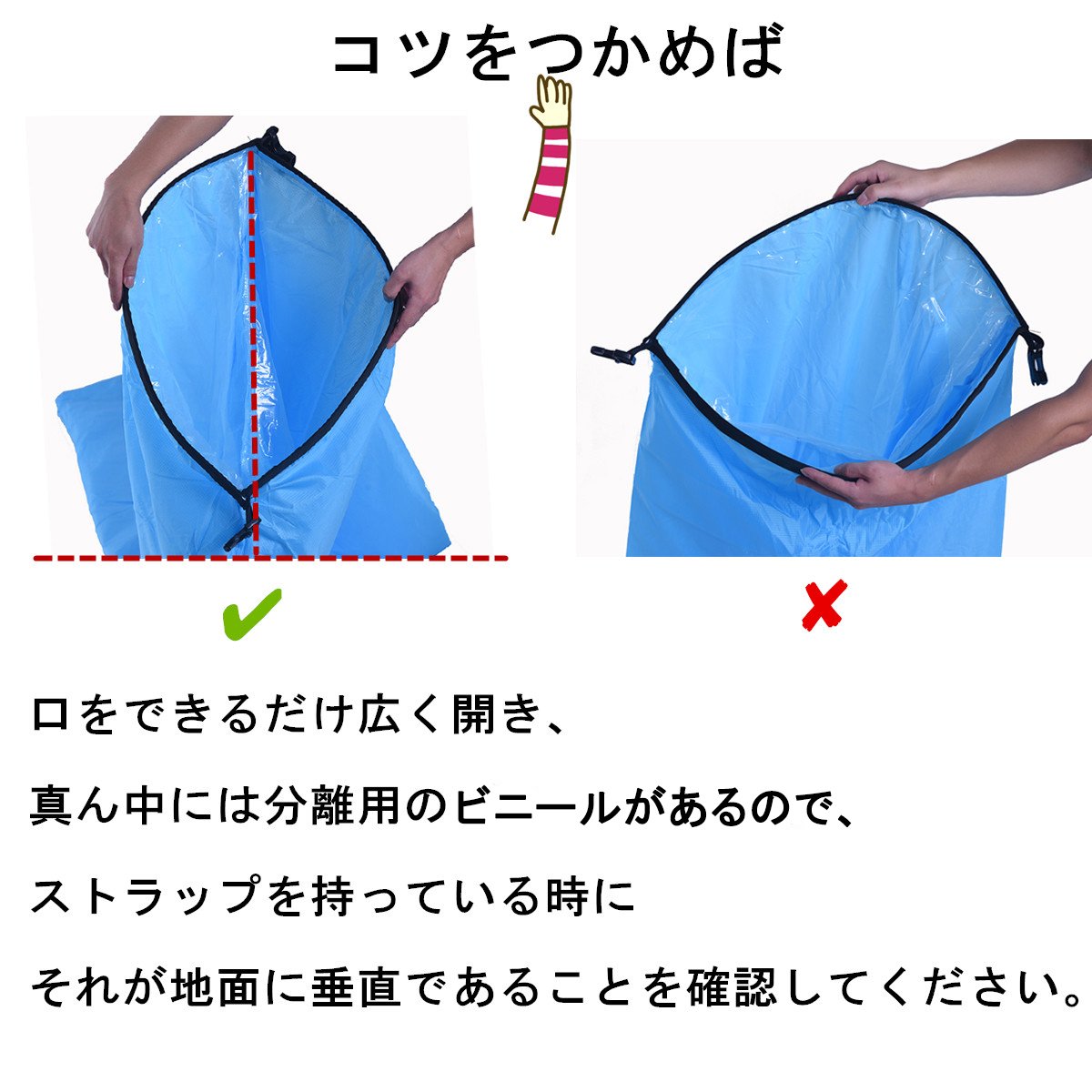 2. Open the entrance as wide as possible, and in the middle there is a vinyl for separation, so please make sure it is perpendicular to the ground when you have a strap.
