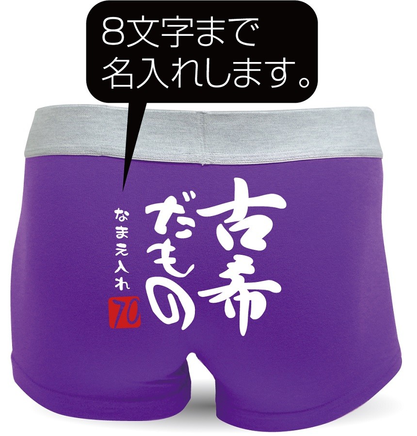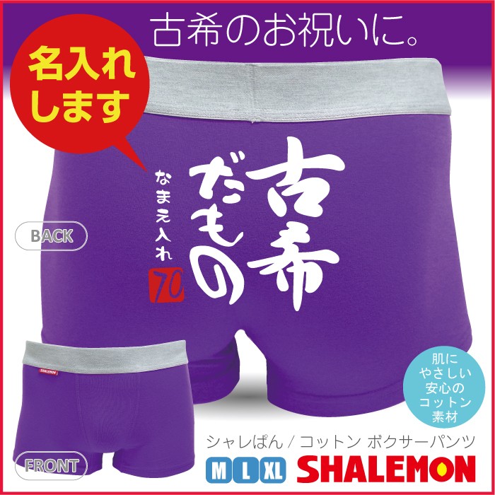 70歳のお誕生日プレゼントに、「古希だもの」シリーズが人気です。古希のお祝いに実用性抜群のインナーパンツを父・母・おじいちゃん・おばあちゃん、ご両親にプレゼントしませんか?当店“シャレもん”のボクサーパンツは伸縮性の高いコットン素材を使用し男女共に着用できます。おなまえの部分に8文字まで名入れできます。※文字は白色です。ひらがなでの名入れがお勧め!漢字での名入れは明朝体になりますので、ご了承ください。きっと笑顔になる素敵なプレゼントです。
