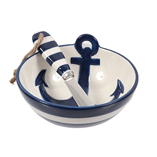 Entertain in style with this nautical dip bowl and spreader set! Ceramic dip bowl features embossed anchor design with matching striped spreader with rope detail. Set of 2. Packed in an acetate box.