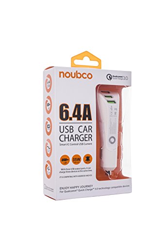 Noubco PwrBoost+ Three Ports USB Car Charger 6.4A, Qualcomm Quick Charge 3.0 Charger for Galaxy S7 / S6 / Edge / Plus, Note 5 / 4 and QualSmart for iPhone, iPad Pro / Air 2 / mini and More - White