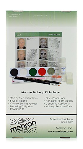 Mehron Premium Monster/Frankenstein Character Kit has all the makeup and supplies to dress up as Frankenstein or a monster of your choice. Mehron has a rich heritage of creating professional character makeup since 1927. Dress up like a pro by simply following the step-by-step instructions from professional artists. Includes: 5-Color Makeup Palette, Colorset Powder, Modeling Putty/Wax, Pencil Liner, Powder Puff, Non-Latex Triangular Foam Wedge, Cosmetic Brush and step-by-step instructions.Feature