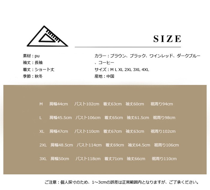 ライダースジャケット メンズ レザージャケット ショート丈 フェイクレザージャケット 無地 pu革 秋冬アウター ブラック 黒 大きめ 革ジャン 新作 レザージャケット メンズ ショート丈 大きめ 秋冬アウター商品詳細素材:pu袖丈:長袖着丈:ショート丈季節:秋冬カラー:ブラウン、ブラック、ワインレッド、ダークブルー、コーヒーサイズ:M L XL 2XL 3XL 4XL産地:中国サイズ参照表M 肩幅44cm バスト102cm 着丈63cm 袖丈60cm 裾周り94cmL 肩幅45.5cm バスト106cm 着丈65cm 袖丈61.5cm 裾周り98cmXL 肩幅47cm バスト110cm 着丈67cm 袖丈63cm 裾周り102cm2XL 肩幅48.5cm バスト114cm 着丈69cm 袖丈64.5cm 裾周り106cm3XL 肩幅50cm バスト118cm 着丈71cm 袖丈66cm 裾周り110cmご注意:個人採寸のため、1~3cmの誤差は正常範囲内となりますが、ご了承ください。ライダースジャケット メンズ レザージャケット ショート丈 フェイクレザージャケット 無地 pu革 秋冬アウター ブラック 黒 大きめ 革ジャン 新作 レザージャケット メンズ ショート丈 大きめ 秋冬アウター