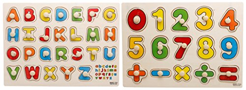 -. Feature : Set of 2 wooden peg puzzles, they are numbers and alphabet puzzles. / Contains jigsaw puzzles with Numbers, letters, alphabet and simple arithmetic. / Learn basic cognition and simple operation, chocking hazard for the baby under 3 years. / Developing hand-eye coordinated ability, and visual perception skills. / Durable wood construction with colorful illustrations.
