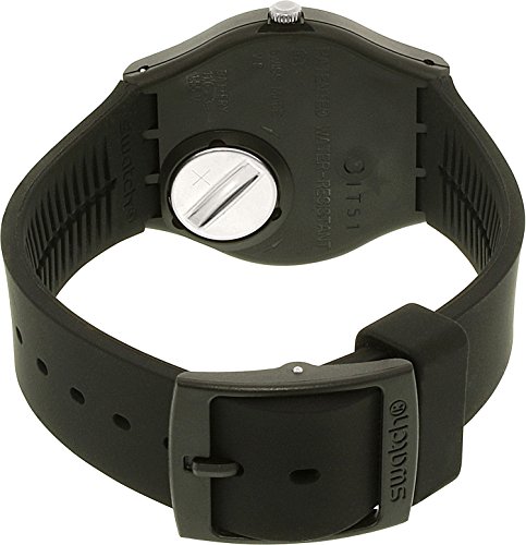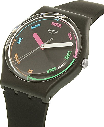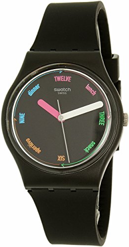 Swatch GB289 Power Tracking The Strapper women's watch features a 34mm wide and 9mm thick black plastic case with a fixed bezel and textured push-pull crown. Swatch GB289 is powered by an accurate Swiss quartz movement. This beautiful watch also features a sharp looking black dial with pink and white luminous hands and alphabetic hour markers, scratch resistant acrylic crystal and water resistant to 30 meters. Swatch GB289 is equipped with a 16mm wide black silicone rubber strap with a buckle clasp. Swatch GB289 women's Power Tracking The Strapper black dial black silicone strap watch is brand new and comes in an original Swatch gift box and is backed by a 2 year store limited warranty.Feature