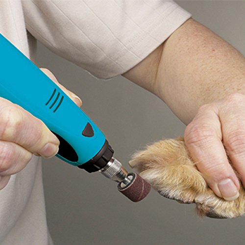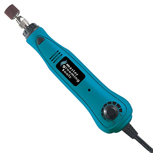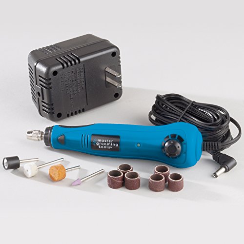 Master Grooming Tools professional pet nail grinder safely and efficiently grooms pets' nails for fast, smooth and accurate results. Powerful motor delivers 18,000 RPM. Features quick-change collet for easy changing of attachments and finger grooves with rubber, sure-grip pads for better control and a convenient hanging hook. UL listed. Nail Grinder includes a limited 1-year manufacturer's warranty. Includes AC adapter, 1 grinding drum, 3 60-grit medium sanding bands and three 100-grit fine sanding bands, large and small grinding stone each, 1 felt polisher. Available in blue color. 12-1/2-feet cord length. This product weighs is 0.60-pound. Measures 12-1/2-inch nail grinder length.Feature