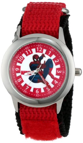 -. Binding : Watch -. Brand : Marvel -. Color : White -. Department : boys -. EAN : 0843231062771 -. Feature : Round Time Teacher Stainless Steel Watch with Marvel's Spider-Man character on dial. / Meets or exceeds all US Govt requirements and regulations for Children's watches. / Recommended for Ages 3-7 years old. Includes a Time Teacher Punch Out clock for Parents to Teach their Children. / Accurate Japanese Quartz movement, scratch resistant mineral crystal, hook and loop Nylon strap / Water Resistant to 99 feet: withstands rain and splashes of water, but not showering or submersion. / 1 Year Limited Manufacturers Warranty -. Label : Marvel Comics -. Manufacturer : Marvel Comics -. Model : W000312 -. MPN : W000312 -. NumberOfItems : 1 -. PackageQuantity : 1 -. PartNumber : W000312 -. ProductGroup : Watch -. ProductTypeName : WATCH -. Publisher : Marvel Comics -. ReleaseDate : 2012-10-01 -. Studio : Marvel Comics -. Title : Marvel Kids' W000312 Marvel Spider-Man Stainless Steel Time Teacher Red Nylon Strap Watch -. UPC : 843231062771