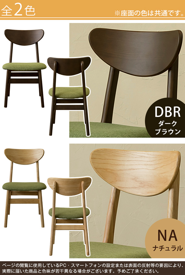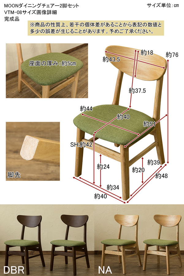 本商品はお取り寄せ商品のため、稀にご注文入れ違い等により欠品・遅延となる場合がございます。誠に恐れ入りますが、何卒ご了承ください。 また、以下の場合には追加送料がかかる場合がございます。  ・大型商品の複数購入時 ・同梱区分が異なる商品の複数購入時  【出荷目安】:1 - 5営業日 ※土日・祝除く 【同梱区分】:TS 1490 【梱包サイズ】:大型商品 【代引き決済】:不可  配送伝票の依頼主は出荷元(メーカーもしくは仕入元)名となる場合がございますので、お受け取りの際はご注意ください。   【型番】vtm08  【商品名の色やサイズについて】 こちらは「VTM-08DBR (7.8)MOON ダイニングチェア 2脚セット DBR」の商品ページです。商品画像や商品情報には、色違いやサイズ違いの商品が載っている場合がございます。ご注文前に色・サイズ・セット内容のご確認をお願いいたします。  MOON ダイニングチェア 2脚セットです  背もたれは半円形 緩やかなカーブが背中にフィットします 座面は通気性の良いファブリック張りです  ダークブラウン(DBR)とナチュラル(NA)の2色展開です ※座面は同じ色です  幅440×奥行510×高さ760mm(梱包サイズ:幅450×奥行590×高さ880mm) 座面高:約420mm 本体重量:1脚 5.1kg(梱包重量:12.3kg) 完成品(1個口) 座面:張り材→ファブリック、内材→ウレタンフォーム 背もたれ:積層合板(PU塗装) 脚:天然木ラバーウッド(PU塗装) 原産国:ベトナム  【ご注意事項】 ※本商品は、北海道・沖縄・離島への配送はいたしかねます。あらかじめご了承ください。 ※配送希望日時指定は承りかねます。大変お手数ですが、出荷連絡後、お客様と配送業者との間でご調整ください。