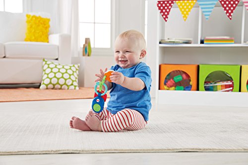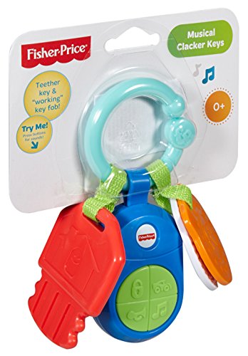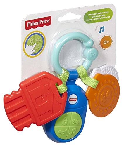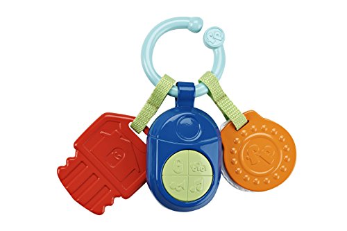 -. Feature : Get the fun started; Press electronic key fob for realistic sounds and upbeat music / Teether key / Keys "clack" / Hands-on activities can be key to fine motor skill development / Bright colors, sounds, music and interesting textures help strengthen baby's senses