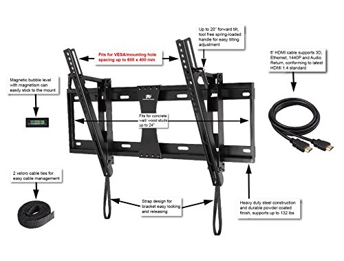 -. Binding : Electronics -. Brand : Mounting Dream -. Color : Black -. EAN : 6920138100653 -. Feature : Fits for most of 42-70" LCD/LED/Plasma TVs up to VESA 600x400 and 132lbs (Fits VESA 600X400, 600X200, 500X300, 400X400, 400X300, 400X200, 300X300, 300X200, 200X200, 200X100, 200X150mm). Please check VESA (mounting hole patern), stud spacing, possible blocked cable/input and TV weight P.R.Ior to making purchase decision to determine whether this TV wall mount fits your TV and the installation application. / Fits 16" or 24" studs plus concrete wall NOT for dry wall installation. (For installation above fireplace and TV need to be centered, it is better to check first your stud spacing/position and the possiblity of centering P.R.Ior to making purchase decision. You might need to order a larger mount with 32" wall plate to accomodate centering requirement). Flush tilt design for better views and glare reducing, 0-20 degree forward tilt / Strap designs for bracket easy safety locking and releasing, finish of the mount and all hardware is RoHS (Restriction of Hazardous Substance) certified / Tool free sP.R.Ing-loaded handle for easy tilting adjustment / All hardware, 6' HDMI cable, bubble level included (6' HDMI cable supports 3D, Ethernet, 1440P and Audio Return conforming to latest HDMI 1.4 Standard) -. Label : Shenzhen Xinadda Ir-Pi Products Co.,Ltd -. Manufacturer : Shenzhen Xinadda Ir-Pi Products Co.,Ltd -. ManufacturerPartsWarrantyDescription : Replacement parts provided free 10 years -. Model : LYSB00NHS96PW-ELECTRNCS -. MPN : MD2165-LK -. PackageQuantity : 1 -. PartNumber : MD2165-LK -. ProductGroup : Speakers -. ProductTypeName : AV_FURNITURE -. Publisher : Shenzhen Xinadda Ir-Pi Products Co.,Ltd -. Studio : Shenzhen Xinadda Ir-Pi Products Co.,Ltd -. Title : Mounting Dream MD2165-LK Tilt TV Wall Mount Bracket for most of 42-70 Inches TVs with VESA 200X100 to 600X400mm, Loading Capacity 132 lbs, 0-20 Degree Forward Tilt, Including 6 ft HDMI Cable and Magnetic Bubble Level (for 42, 47, 48, 49, 50, 51, 55, 60, 64, 65, 70 inch TV)
