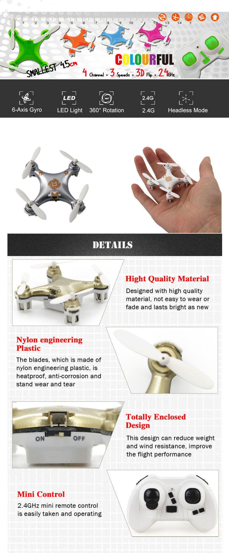 Features With Headless Mode,no need to adjust the position of aircraft before flying 4 Channel which can do ascend, descend, forward, backward, left sideward fly, right sideward fly and throw to fly It has 6-axis gyro which can have more stable flying and be easy to control It has 3 speeds with high, middle and low. It can be self-adjusting which is easier for new players to handle. Left rotation, right rotation, hover It can realize 3D tumbling in four directions with 4 LED lights. Battery for protection