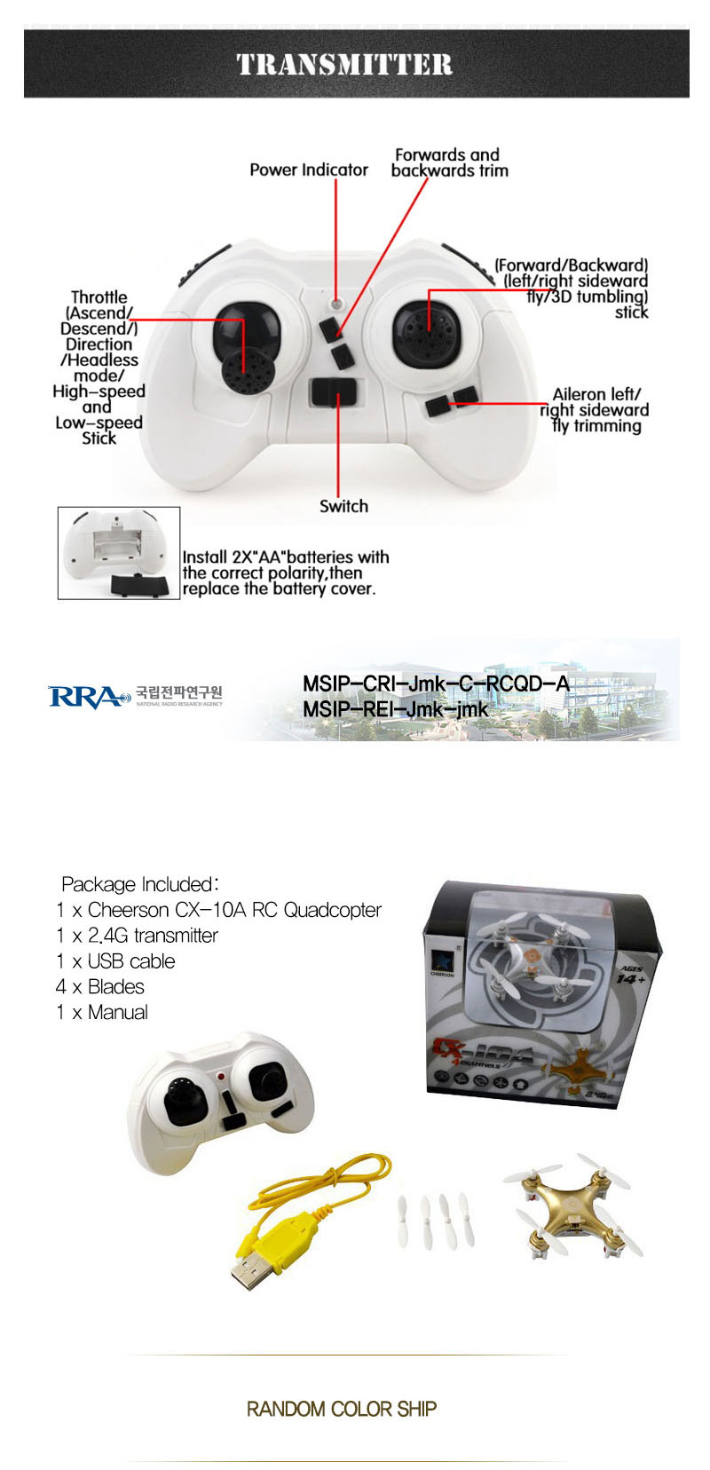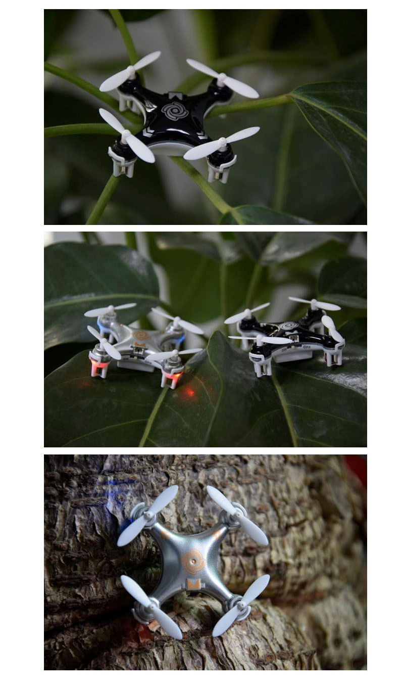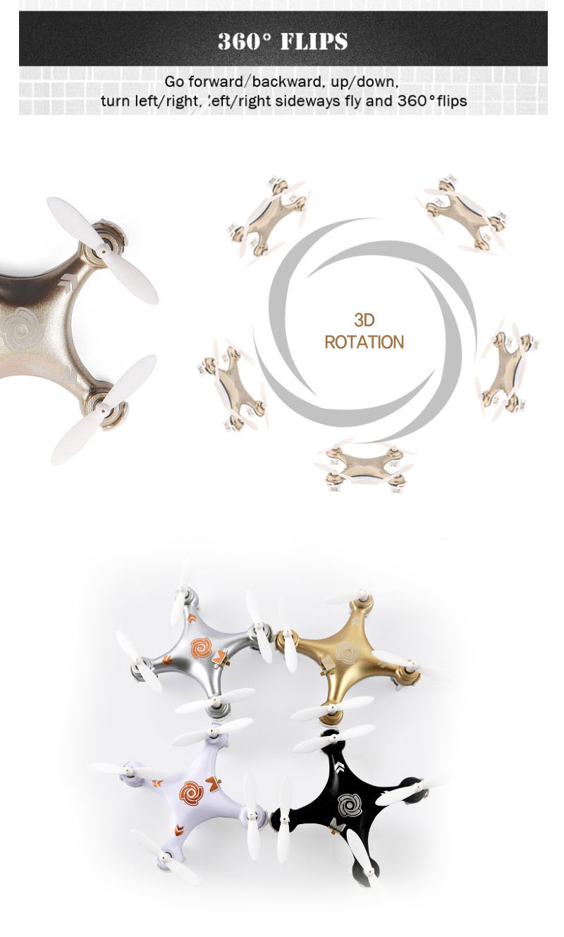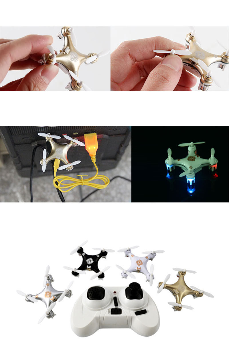 Description Item name Cheerson CX-10A Headless Mode RC Quadcopter Frequency 2.4G Gyro 6 axis Product size 404022mm Quadcopter weight about 12g Diameter of blade 30mm Product battery 3.7V 100MAH Remote battery 2XAAA dry battery Charging time 30mins Flying time about 5~10mins RC distance about 20m Flying distance about 20m Color black,white,silver,golden Certificates CE,ROHS,EN71, EN62115,R&TTE,ASTM,HR4040