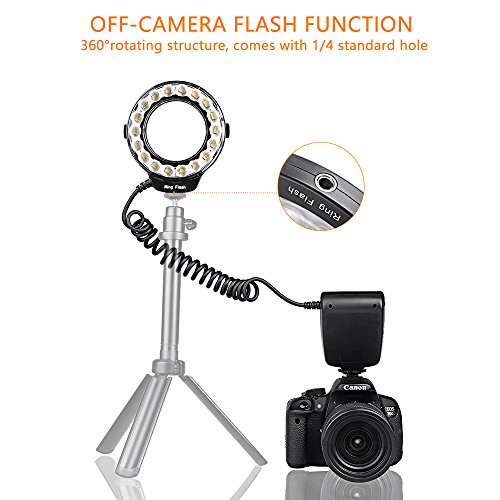 5. With 1/4'' standard screw hole connector, this RF-600D ring flash can be mounted on a camera as photography light.
