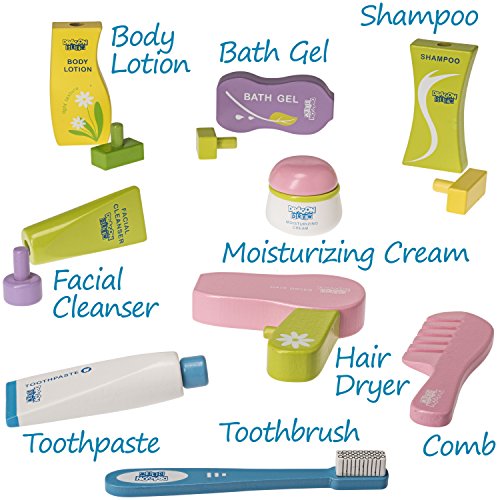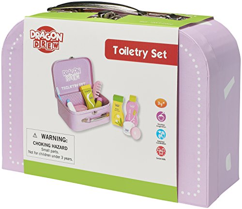 This adorable Beauty/Toiletry Set comprises of body lotion, moisturizing cream, shampoo, bath gel, facial cleanser, toothbrush, toothpaste, comb and hair dryer. Convenient case for your girl to store her beauty & toiletries in and for a hassle free cleanup. Going on a family trip? Have your princess take her Beauty & toiletry set along to stay fresh and clean. Perfect to educate your child in basic hygiene while encouraging roll play, imaginative thinking, questioning and reasoning. Dragon Drew products are made up of 100% real wood and comply with all international toy safety standards. Made from renewable resources with non-toxic paints for safe play.Feature