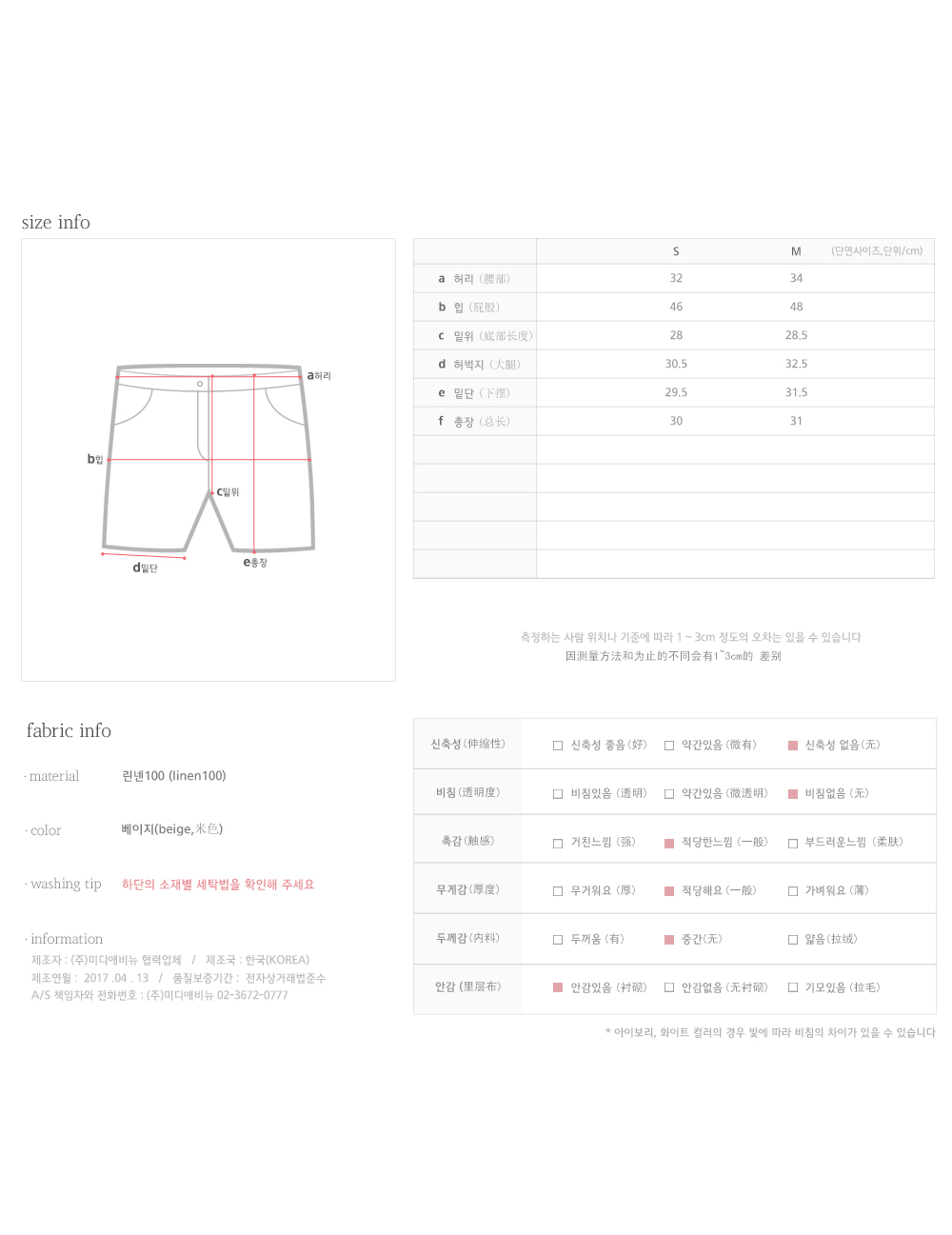 린넨 100 소재로 제작된 치마바지예요:)