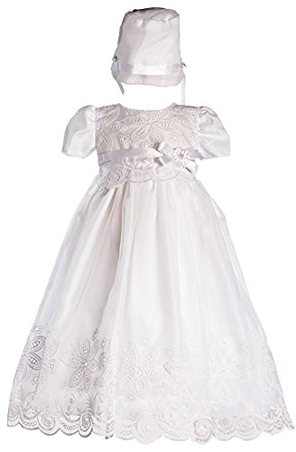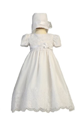 This is a very classy beautiful organza dress that has two types of embroidered flowers; large pointed petals and small round petals. It is accented with leaves and a wave pattern on the bodice and the skirt. Made in the USA.Feature