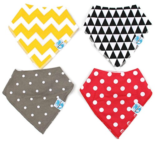 SUPER ABSORBENT DROOL BIBS - Front is 100% soft cotton / Back is polyester fleece for absorbency. Protect & keep your drooly/teething baby dry from all dribble and spit ups. CUTE & COMFORTABLE BABY BANDANA BIBS - Modern set of 4 trendy unisex bibs. Neutral patterns look great on both boys and girls. Ultra comfortable design with baby in mind. UNIQUE BABY SHOWER GIFT SET - Best gift for new moms. "These bibs are amazing. They are stylish, comfortable and so soft