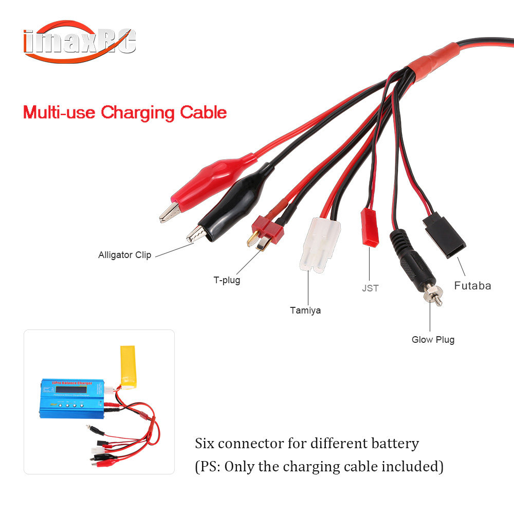 T-plug, JST, Tamiya, Futaba, alligator clip and glow plug for different battery