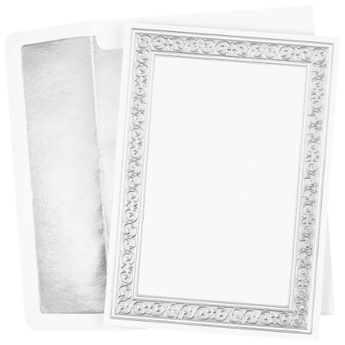 - 25 Flat cards for invitations or announcements, white with silver foil filigree frame