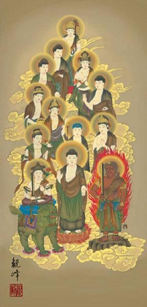 慶事におめでたい絵柄を飾るのと同じく、仏事には佛徳あふれる伝統の仏画を掛けるのが慣わし。繊細な線描で壮大な構図を丹念に描き上げました。 |