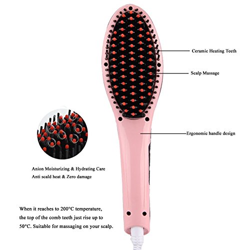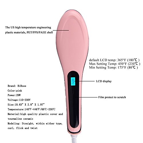 Centigrade to Fahrenheit convert: press " ""-"at same time? Thicker and curls hair: 410~446℉ (210~230 ℃)? Common hair: 374~410℉ H(190~210 ℃)? Thin and soft hair: 338~392℉ (170~200 ℃)? Suggest to choose the Highest Temperature at First time, then reduce the Temp Lever According to Your Hair Quality.? Helpful Hair care tips: use Moroccan oil or Agam essential oil hair treatment (Not Included with the package) with BiBOSS Hair straightener brush to message your hair will improve Frizzy Dry Unmanageable hair effectively.? Safety precautions and warnings? In order to ensure the proper use of this product, please pay attention to the following security matters.? 1. Under 14 years-old children using this product must have adult supervision. 2. Keep it dry and don't use it in bathroom and wet area. 3. Please don't knock it and fall off from high-attitude, please don't use if there is any damage. 4. Please don't rework, dismantle and repair this product. 5. This product can't be put into the fire or external heating. 6. Please wait until cooling when pack up this product. 0 |