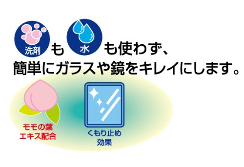 洗剤も水も使用しないで、簡単にガラスや鏡をキレイにします。モモの葉エキス配合で香りさわやか。