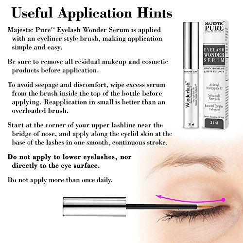 -. Feature : DERMATOLOGIST and CLINICAL LAB TESTED; NON-IRRITATING, ALLERGY Tested Formula. Eyelash Growth Serum by Majestic Pure is developed by a GMP Certified US lab. Uses Non-Prescriptive Actives. It is the perfect alternative to false eyelash extensions and fake eyebrows / Majestic Pure Eyelash Grower Serum is MYRISTOYL PENTAPEPTIDE-17 (10%), SWISS APPLE STEM CELL EXTRACT and BOTANICAL COMPLEX TRICHOLASTYL Based PREMIUM QUALITY Eyelash and Eyebrow Enhancer. Apply on regular basis, your eyelashes will appear thicker and longer with each application. / SAFETY WARNING: For external use only. keep out of the reach of children. Apply small amount to avoid seepage into eyes. Serum coming into contact with eyes can cause discomfort, burning sensation or itching sensation and/or eye redness. Remove any excess serum from the brush before applying it onto your lash line. Stop using if eye redress persists or you notice any other symp and seek physician's advice. If pregnant, consult with your health care provider before use. / Eyelash Serum is supplied in a standard eyeliner style applicator that is simple to use and easy to apply. The 3.5 ml applicator will last over three months. / Purchase with complete peace of mind, we are confident we have developed the absolute best eyelash growth product utilizing highly effective active ingredients. If you are not completely satisfied with Majestic Pure Cosmeceuticals Eyelash Serum, we will refund your entire purchase.