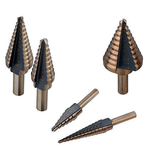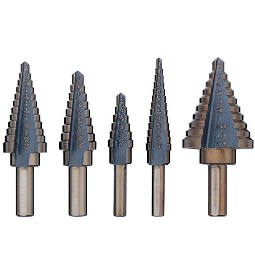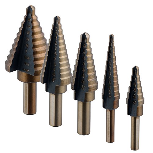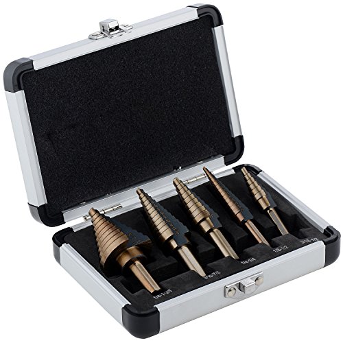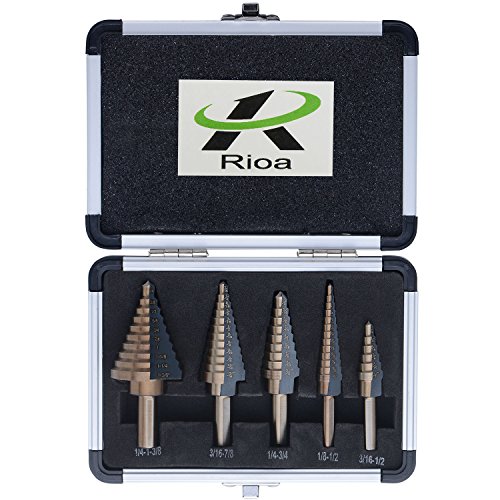 Titanium HSS Step Drill Bits Set with 1/4-Inch and 3/8-Inch Shanks By Rioa, SAE, 5-Piece with Aluminum Protective Case