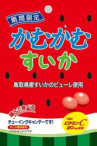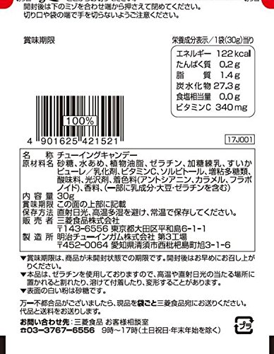 原材料:砂糖、水あめ、植物油脂、ゼラチン、加糖練乳、すいかピューレ/乳化剤、ビタミンC、ソルビトール、増粘多糖類、酸味料、光沢剤、着色料(アントシアニン、カラメル、フラボノイド)、香料、(一部に乳成分・大豆・ゼラチンを含む)