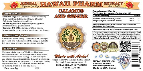 Studio : HawaiiPharm Publisher : HawaiiPharm Binding : Health and Beauty Product Description This liquid extract made from the Certified Organic Calamus (Acorus calamus) dried root from Poland and Ginger (Zingiber officinalis) root from Peru. Calamus also known as Sweet Flag, Cinnamon Sedge, Sweet Myrtle, Acorus and Sweet Rush. The sharp-edged calamus is a perennial semi-aquatic plant that grows in marshes and on muddy banks of streams. Calamus contains bitters, asarone, calamene and related chemicals, eugenol and related chemicals. For preparation of extract we use the dried and chopped rhizome. Ginger Root (Zingiber officinalis) is the most widely used and available herbal remedy on the planet, with billions of people using it every day as both food and medicine. For centuries, Europeans obtained ginger form Arab spice traders, who protected their sources by inviting stories of ginger field located in lands stalked by a fierce people called troglodytes. Ginger contains 1,8-cineole, 6-gingerol, 6-shogaol, 8-shogaol, acetic acid, alpha-linolenic acid, alpha-phellandrene, alpha-pinene, alpha-terpinene, alpha-terpineol, arginine, ascorbic acid, beta-bisolene, beta-carotene, beta-pinene, beta-sitosterol, boron, caffeic acid, camphor, capsaicin, chlorogenic acid, curcumene, gingerols, sesquiphellandrene, zingiberene, resins, starches, fats, proteins. 0